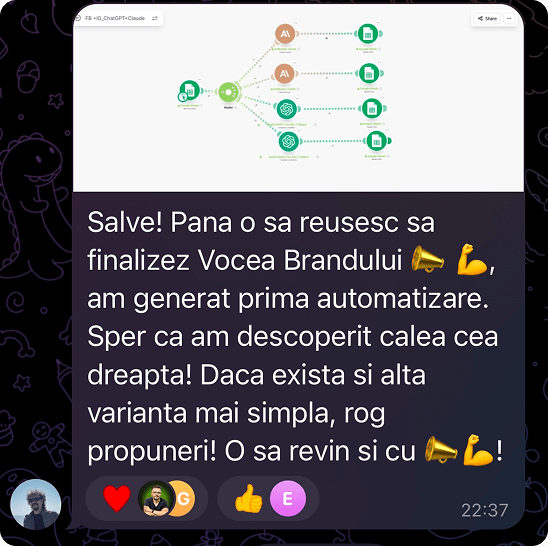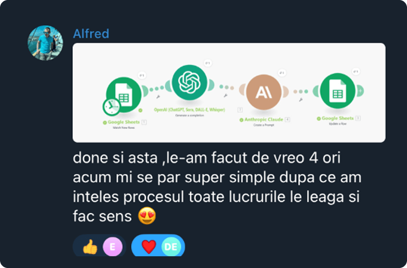 MasterClass-ul este construit 100% pe experiența practică din peste 200 de unelte testate personal și zeci de implementări. Vei vedea studii de caz cu cifre: câte ore economisesc, câți bani salvează și ce impact au avut automatizările în business-uri și echipe active.