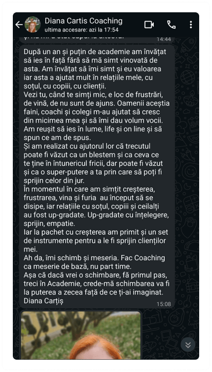 Exact din acest iad mental și emoțional s-a născut metoda care avea să transforme sute de vieți. Diana a început să studieze obsesiv coaching-ul, psihologia, neuroplasticitatea, inteligența emoțională și constelațiile sistemice de familiel. Nu din curiozitate academică, ci din disperarea de a-și salva propria viață.